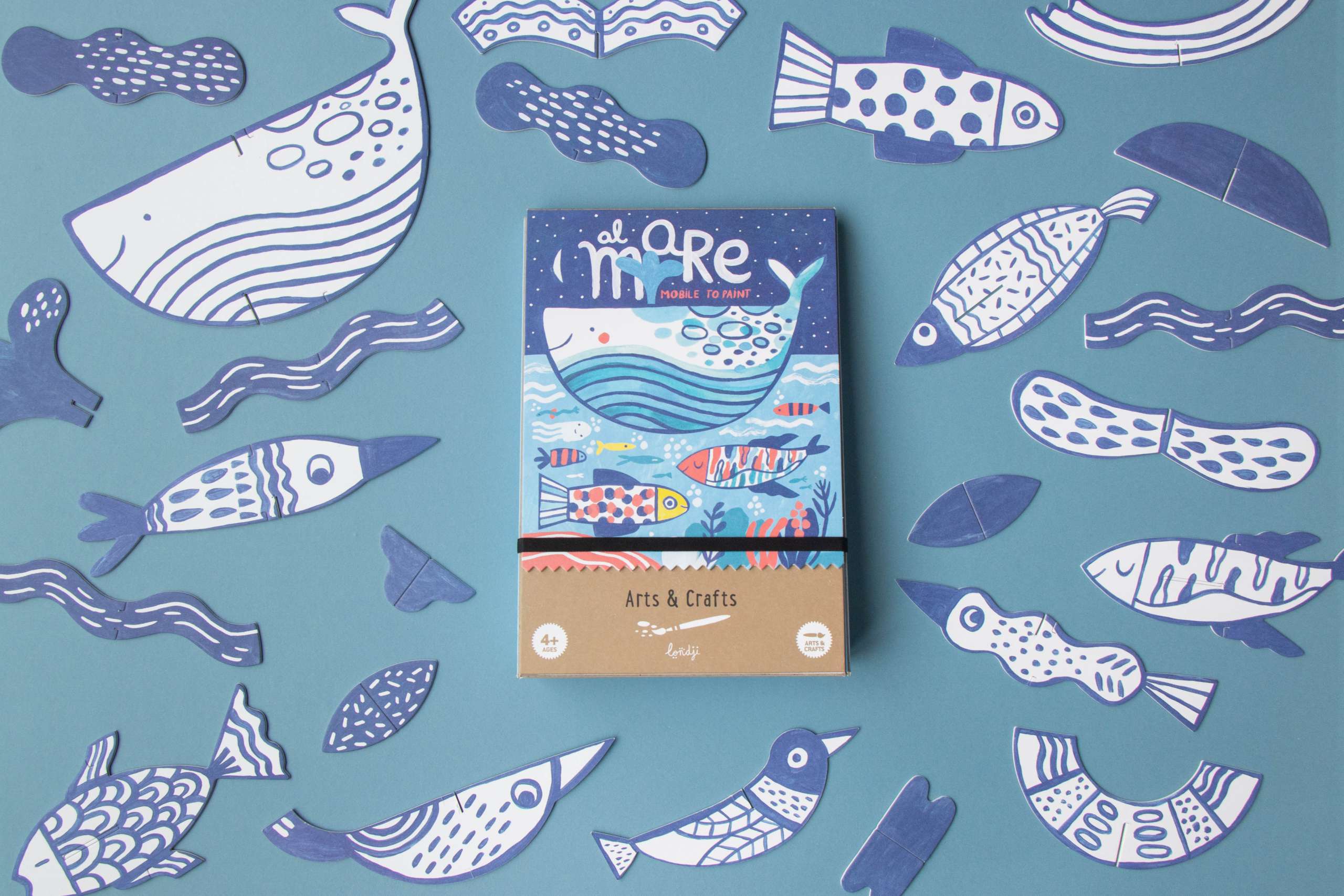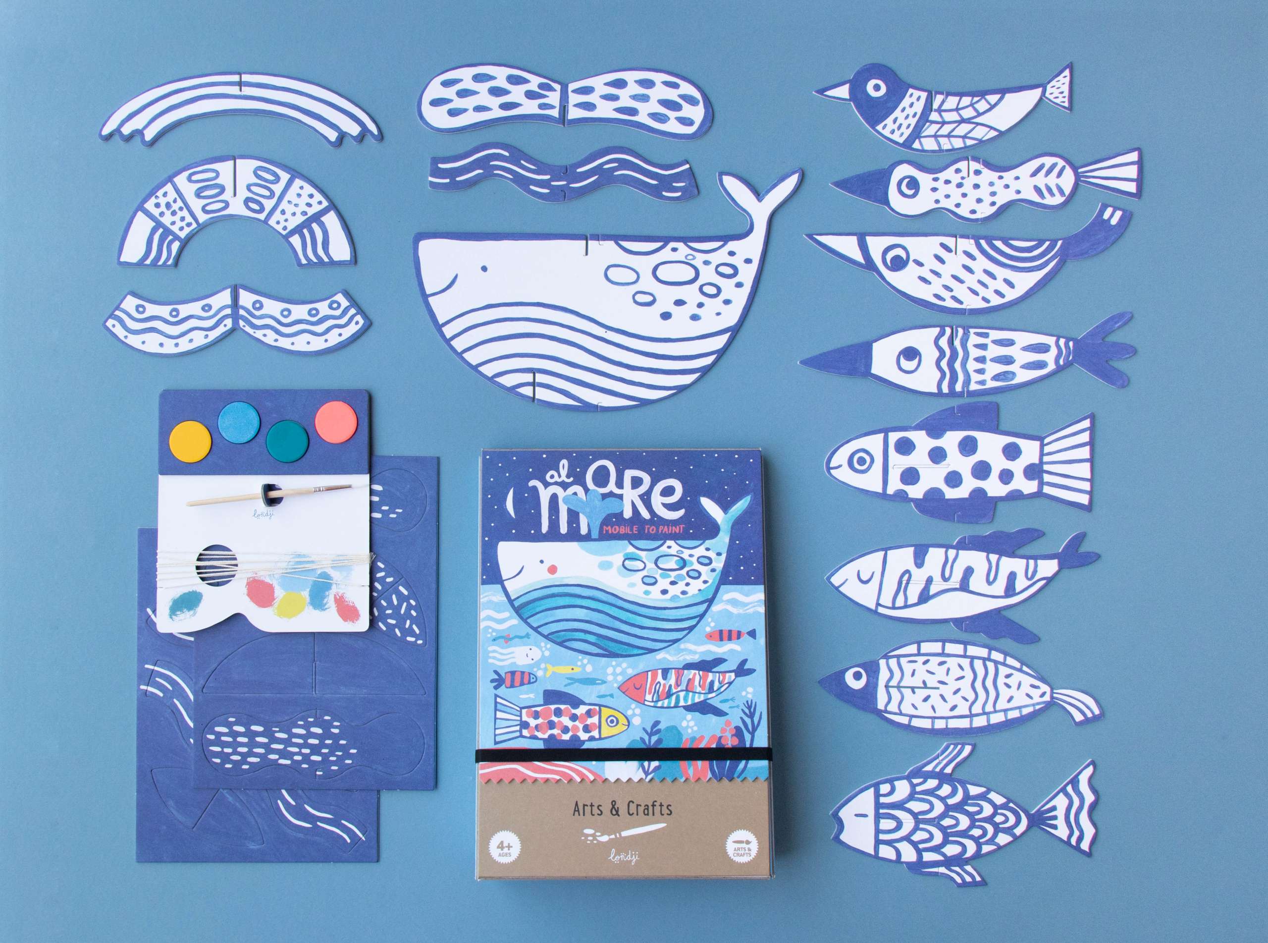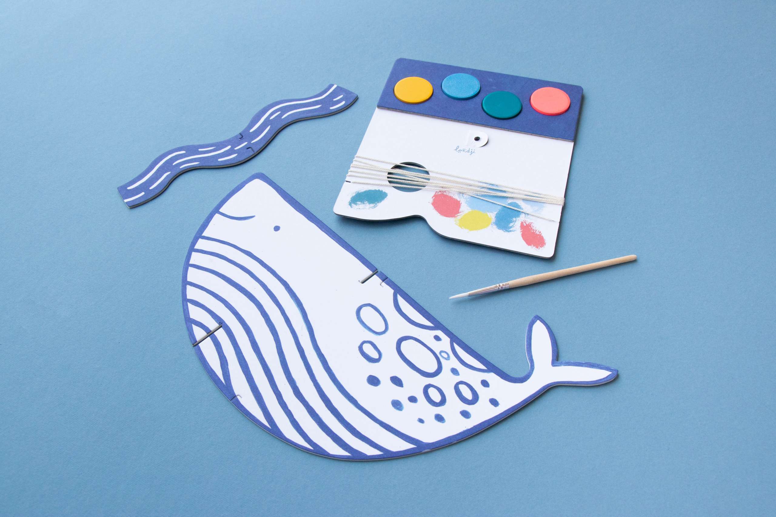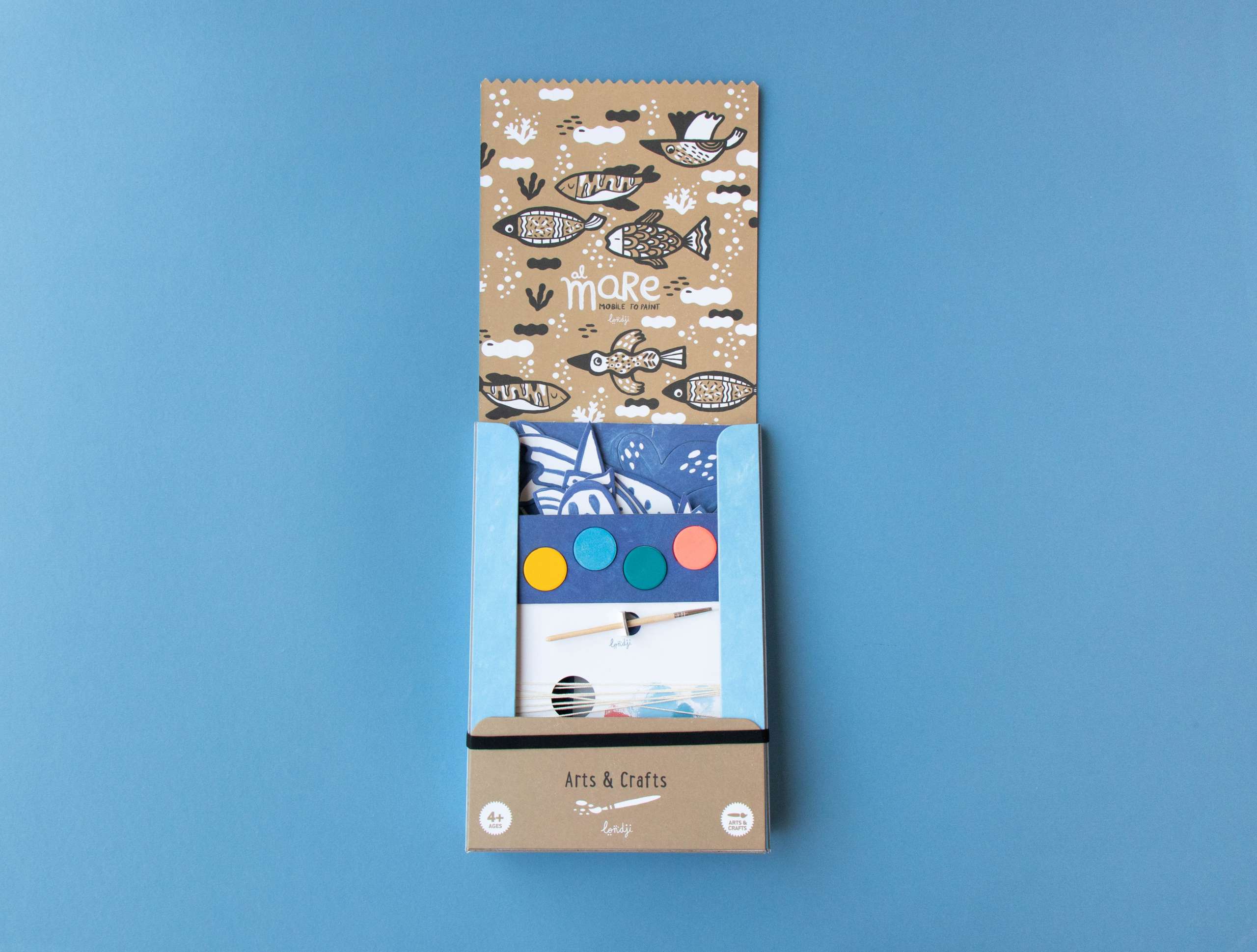 - Rinkinyje yra 2 metrų siūlas, 1 teptukas, kartoniniai jūros gyventojai ir akvarelė.