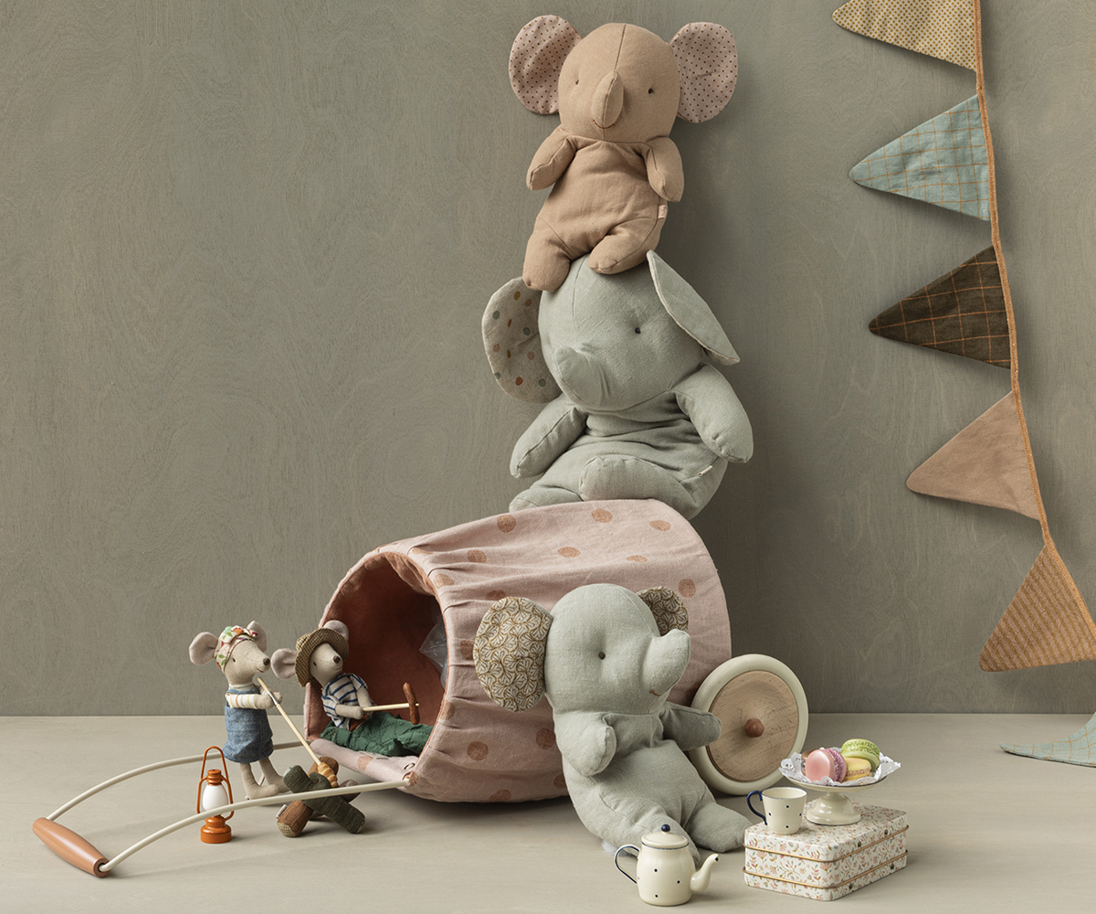 - Drambliukas pagamintas iš pačio minkščiausio audinio ir yra šviesiai pilkos spalvos, jo ausytes puošia taškiukai.